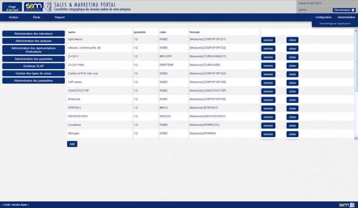 Geoconcept Sales & Marketing Portal s’articule autour de 3 modules métiers (Analyse, Étude et Rapport) et de 2 modules de gestion (Configuration et Administration).