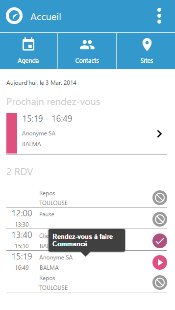 Avec la fonction de signalement de pause (interruption du rendez-vous, pause déjeuner, etc.) et l’horodatage des trajets (jalons « Je pars » et « J’arrive »), le planificateur anticipe d’éventuels retards dans le planning et réajuste au besoin.