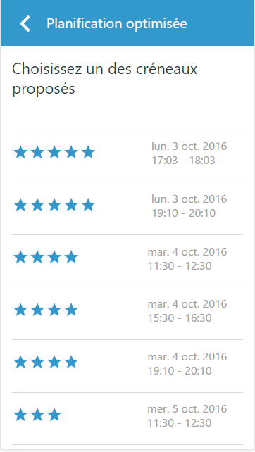 L’ intervenant peut désormais prendre un nouveau rendez-vous avec son client depuis le terrain. Opti-Time traite la demande et renvoie instantanément à Opti-Time Mobile la liste des rendez-vous disponibles. L’intervenant sélectionne dans l’application le créneau souhaité par le client et le rendez-vous est confirmé et enregistré dans le planning de l'intervenant. Un vrai gain de réactivité et d’interaction client pour les équipes sur le terrain.